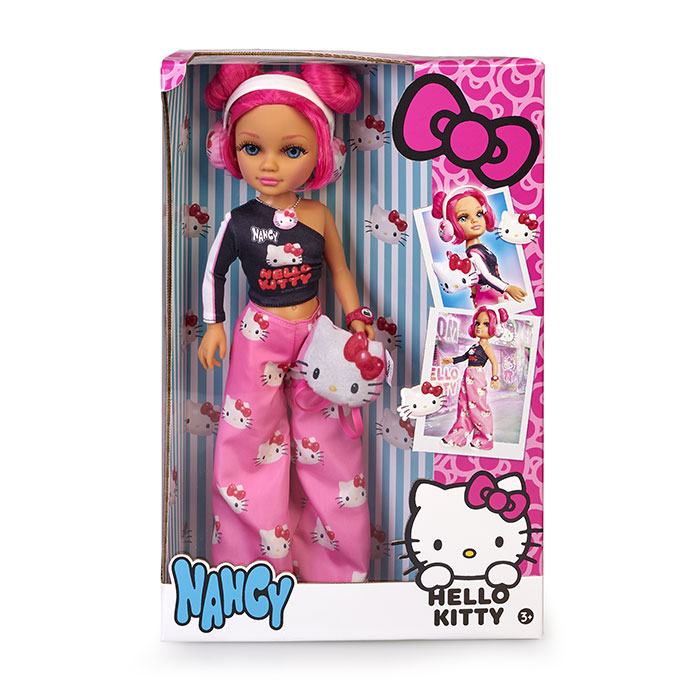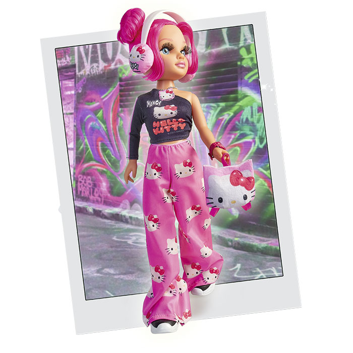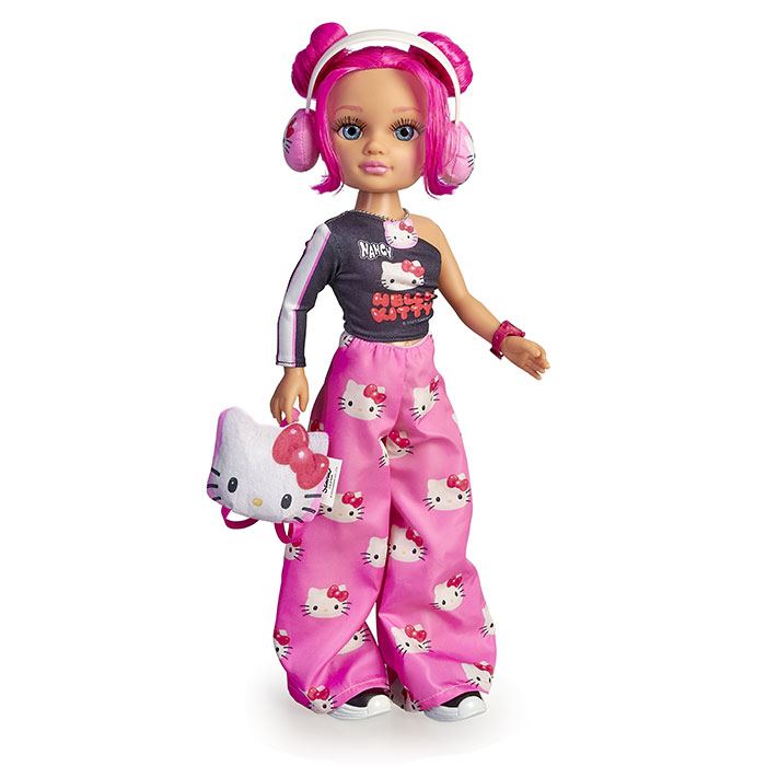 Nancy se une a Hello Kitty con un look moderno y lleno de actitud. Su cabello rosa en moños altos y su outfit urbano con camiseta negra y pantalones anchos reflejan las últimas tendencias. Además, su mochila y auriculares inalámbricos la hacen la compañera ideal para disfrutar de la música y la moda.