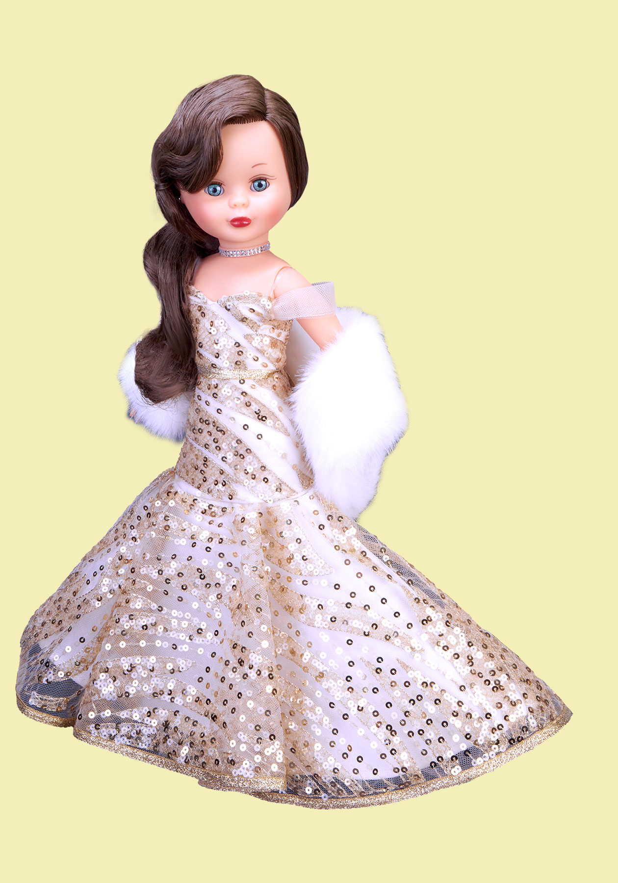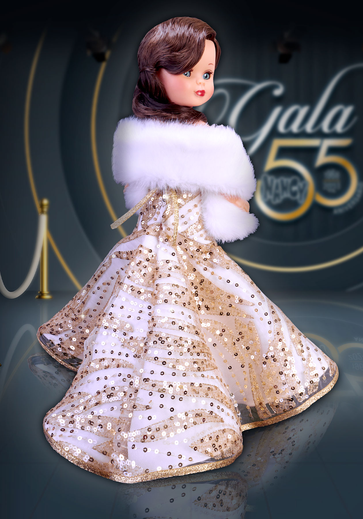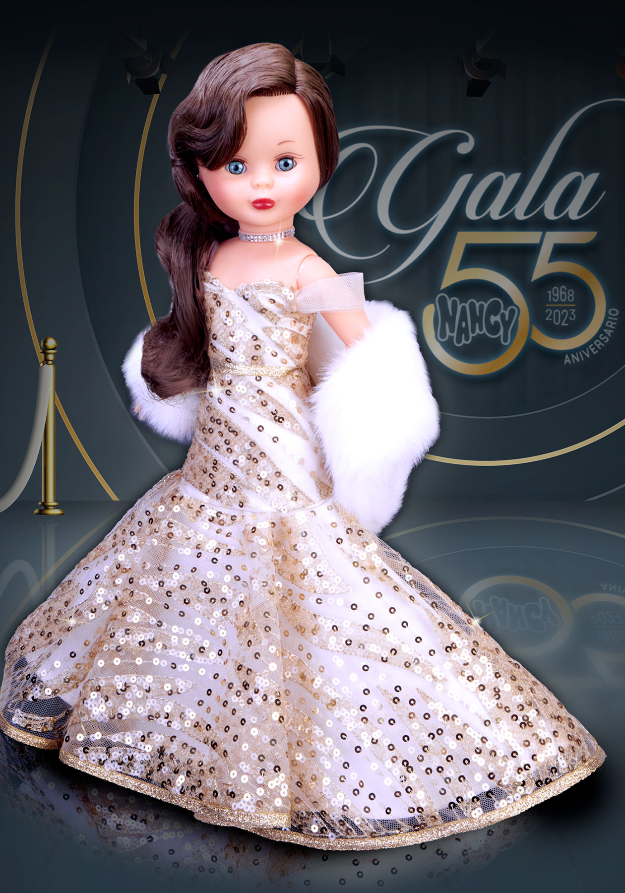 En su 55 aniversario, Nancy se viste con un exquisito y elegante vestido de gala de edición especial. Esta exclusiva Nancy lleva un vestido de gala, con un corte sirena y palabra de honor, bordado en oro sobre una base de seda en color champagne. Este precioso vestido se complementa con un exclusivo chal tipo visón blanco, creando una combinación perfecta. Nancy luce además, como complemento, un brazalete de pedrería y un collar a juego que complementan su look. Su pelo largo moreno está peinado en un elegante moño bajo con ondas al agua. Incluye el certificado de autenticidad y el número de serie único impreso en la muñeca.