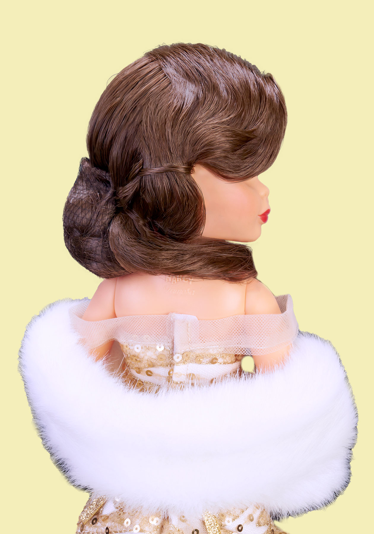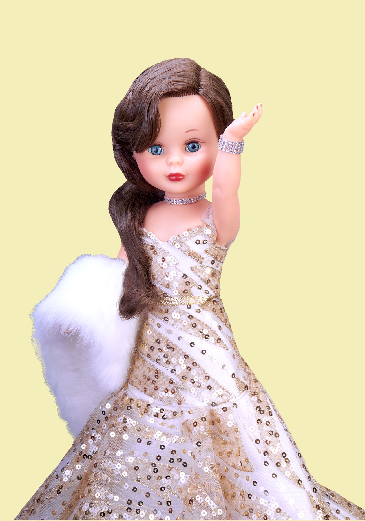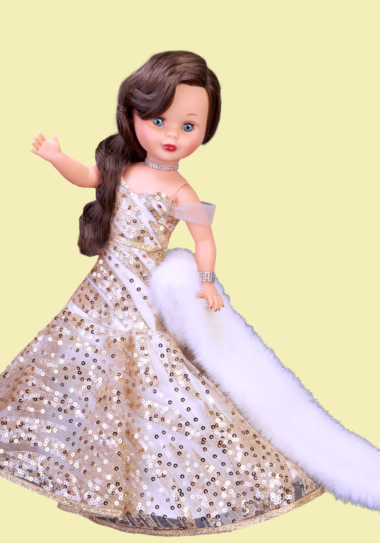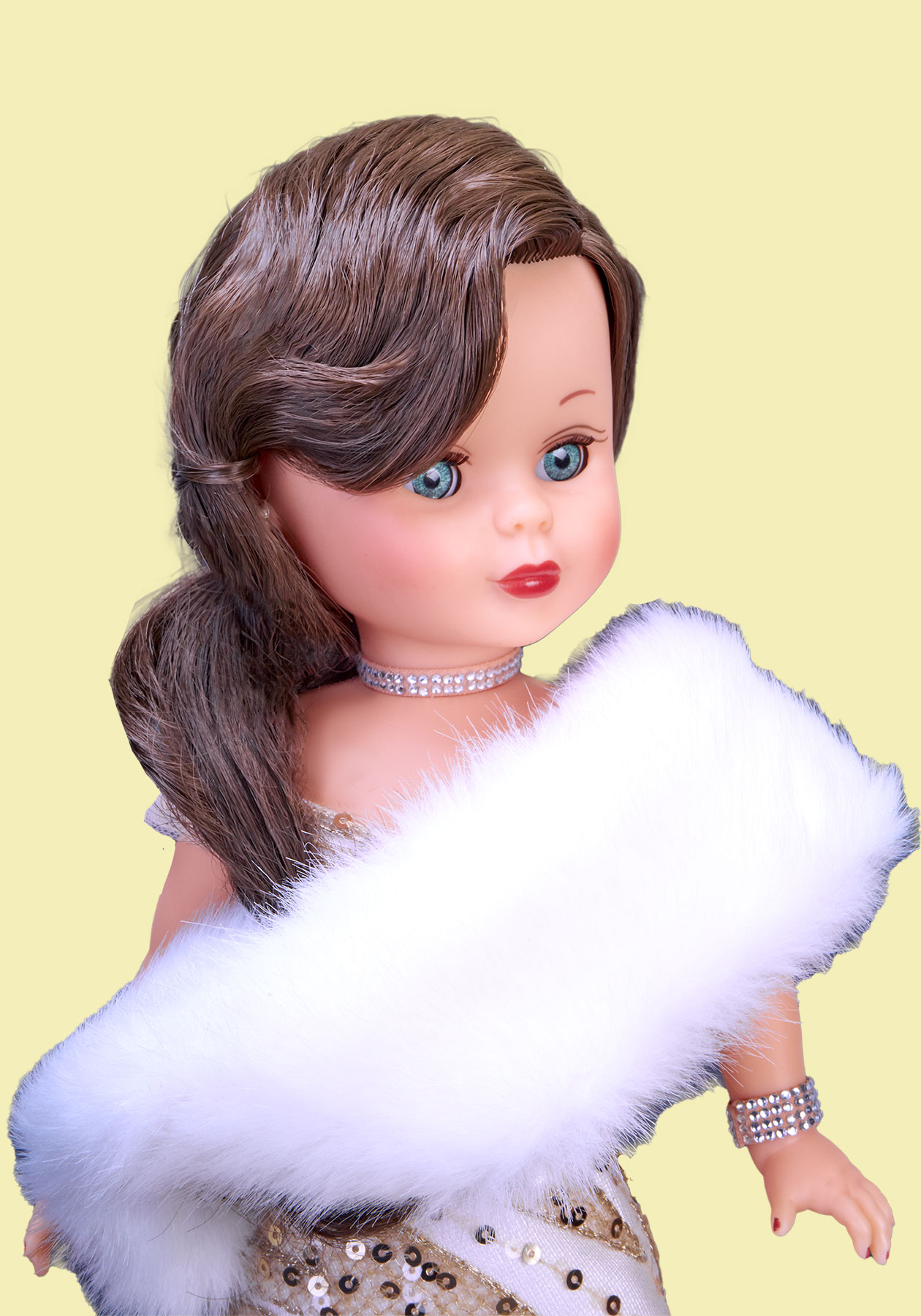 En su 55 aniversario, Nancy se viste con un exquisito y elegante vestido de gala de edición especial. Esta exclusiva Nancy lleva un vestido de gala, con un corte sirena y palabra de honor, bordado en oro sobre una base de seda en color champagne. Este precioso vestido se complementa con un exclusivo chal tipo visón blanco, creando una combinación perfecta. Nancy luce además, como complemento, un brazalete de pedrería y un collar a juego que complementan su look. Su pelo largo moreno está peinado en un elegante moño bajo con ondas al agua. Incluye el certificado de autenticidad y el número de serie único impreso en la muñeca.