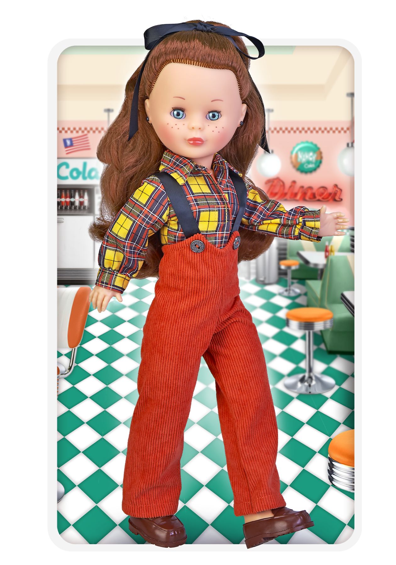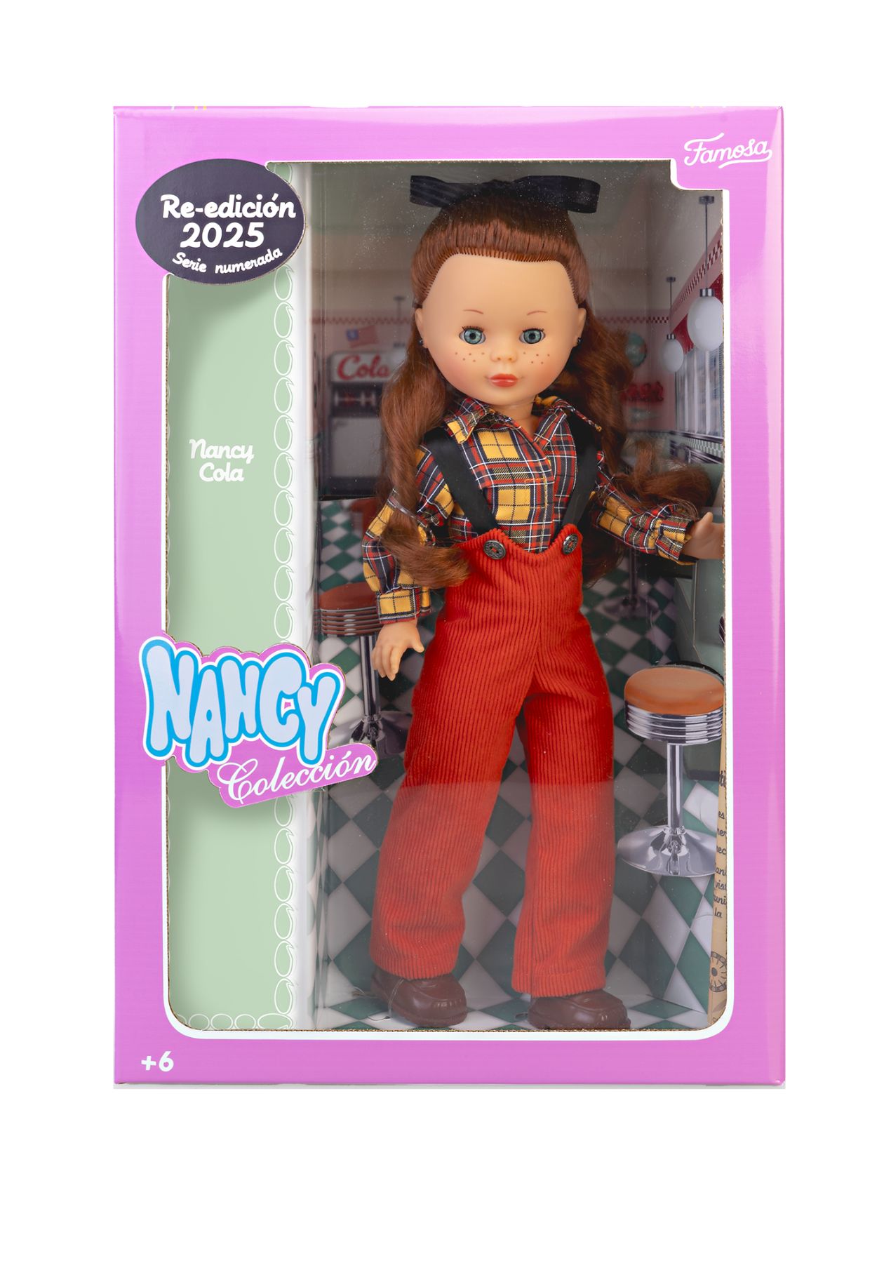Nancy Colección Cola viste un conjunto que es una reedición del modelo original de 1978. Este atuendo clásico se compone de una camisa a cuadros en tonos amarillos, azules y rojos, combinada con un peto rojo de pana largo, que le da un toque retro y sofisticado. Para completar el look, lleva unos mocasines marrones que le aportan un detalle elegante y evocan la moda de los años 70. Además, su cabello castaño largo y ondulado, está semirecogido con un lazo negro, combinando a la perfección con el estilo del conjunto. Cuenta con certificado de autenticidad y de número de serie.