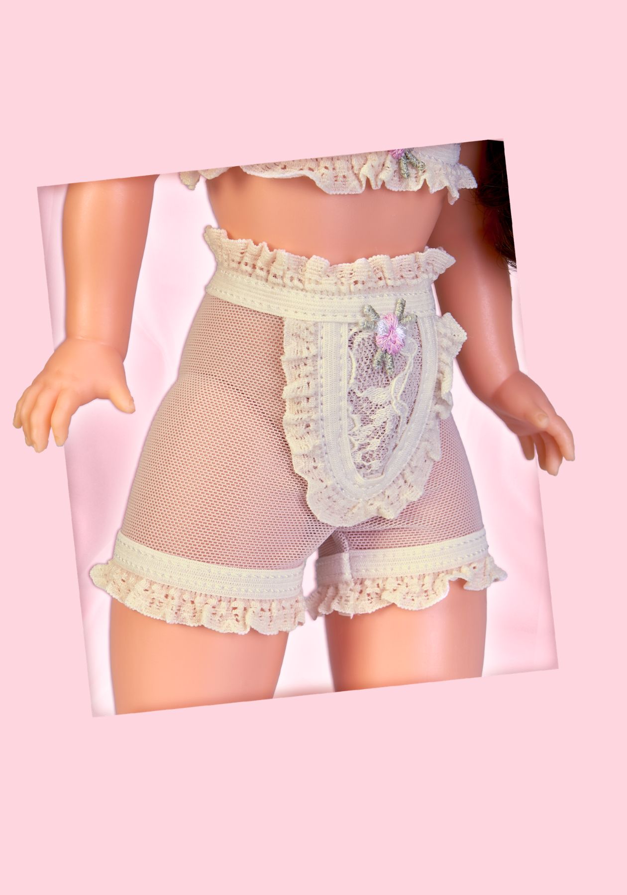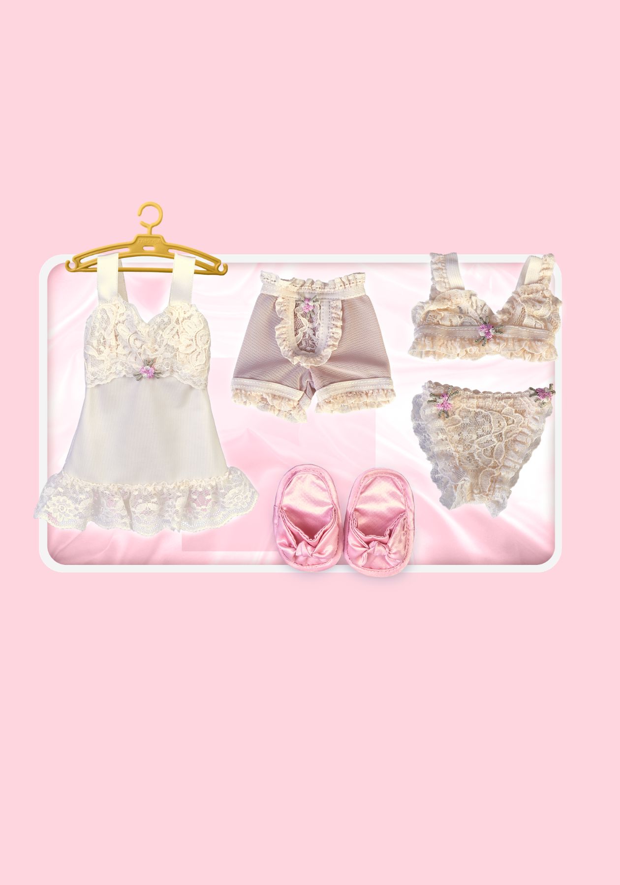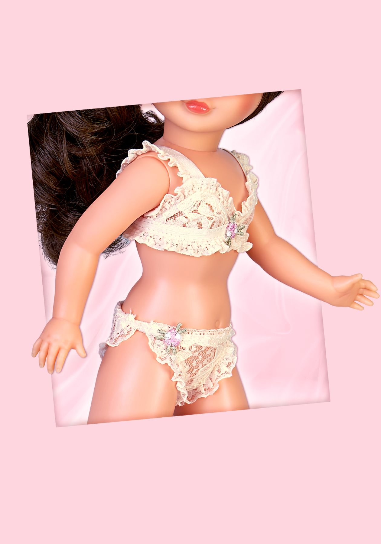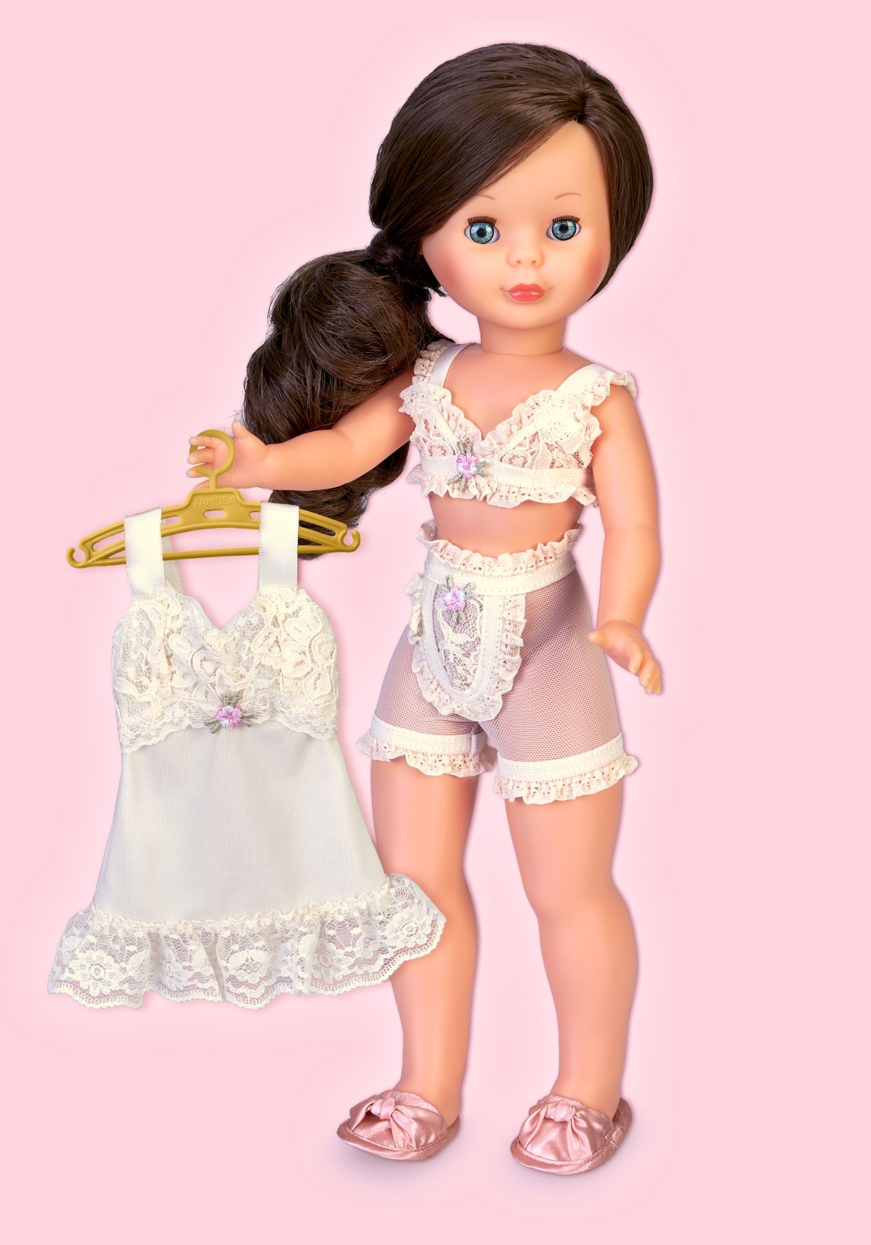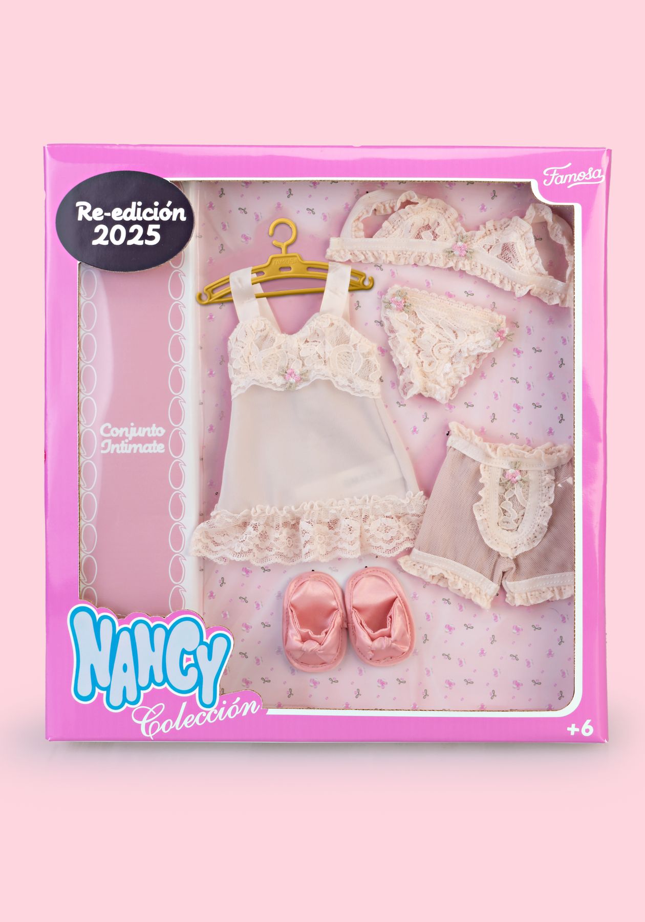 Nancy Colección Conjunto Intimate es una reedición exclusiva de un set de lencería inspirado en el diseño original de 1977. Este conjunto incluye varias prendas íntimas que combinan elegancia y detalle. El sujetador y las braguitas de encaje adornadas con flores de guipour, le aportan un toque romántico y único. La faja de licra con detalles de encaje sutiles, garantiza una silueta elegante, mientras que la enagua de nylon con encaje completa el conjunto. Para darle el toque final, se incluyen unas zapatillas rosas de raso adornadas con un delicado lazo.