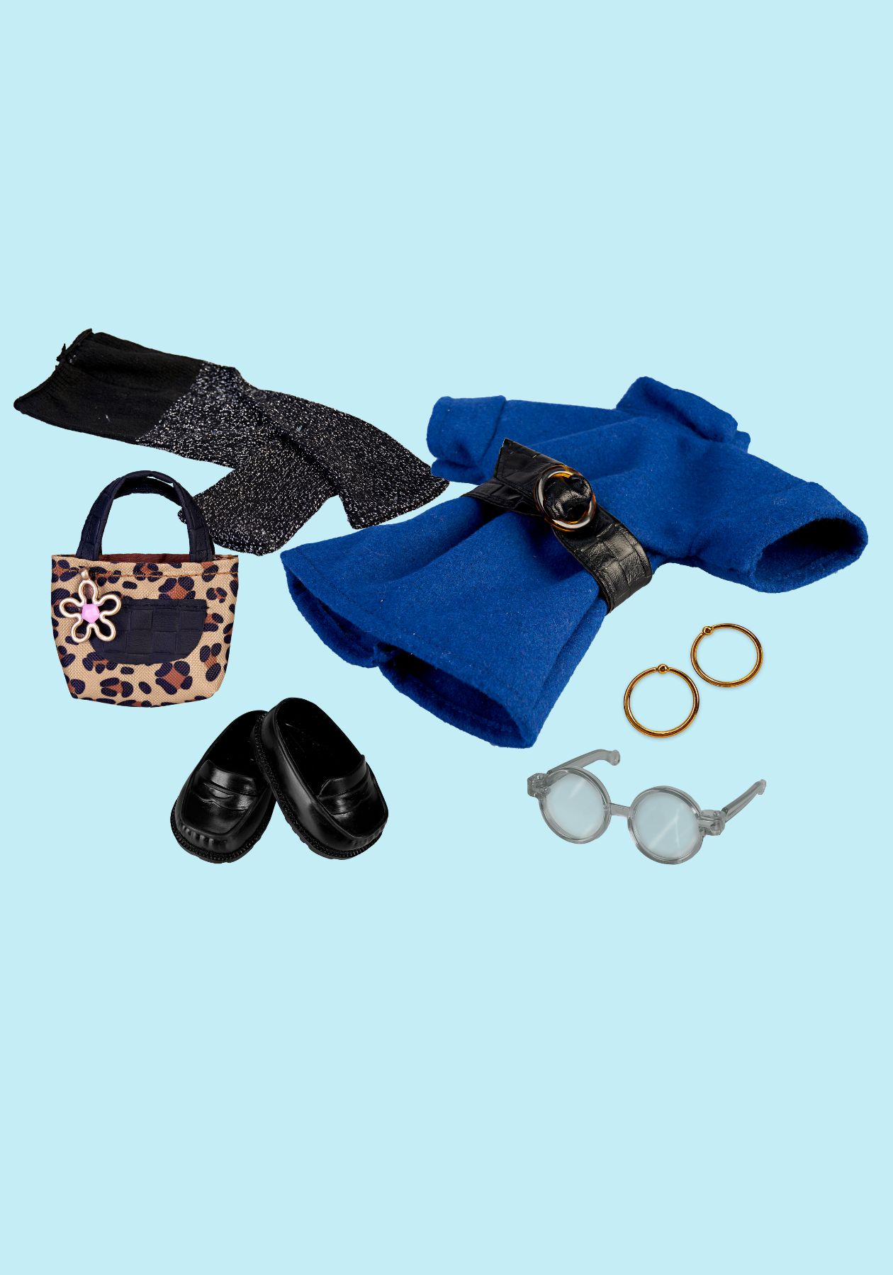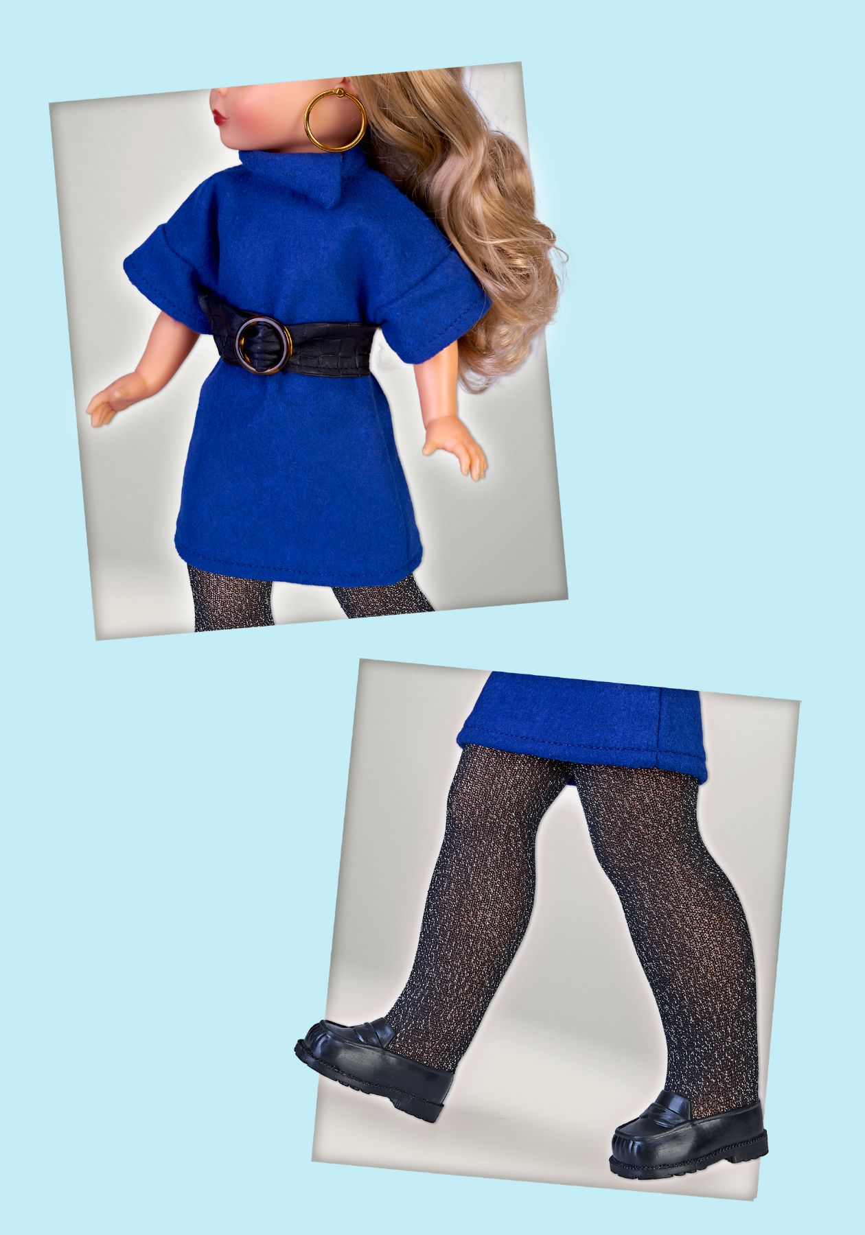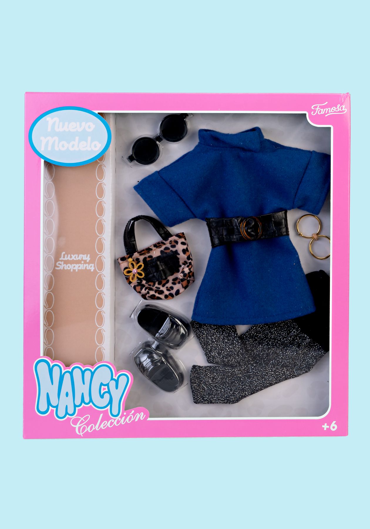 Nancy Colección Conjunto Luxury Shopping es un nuevo modelo de prendas que capturan la esencia de la elegancia y estilo. Este conjunto se compone de un vestido azul eléctrico de media manga y cuello vuelto, que combina con unos leotardos negros adornados con glitter, aportando un toque de brillo y glamour. Para complementar este look, se incluyen varios accesorios: un bolso de leopardo, unas gafas de sol redondas, unos pendientes de aro dorados y unos mocasines negros.