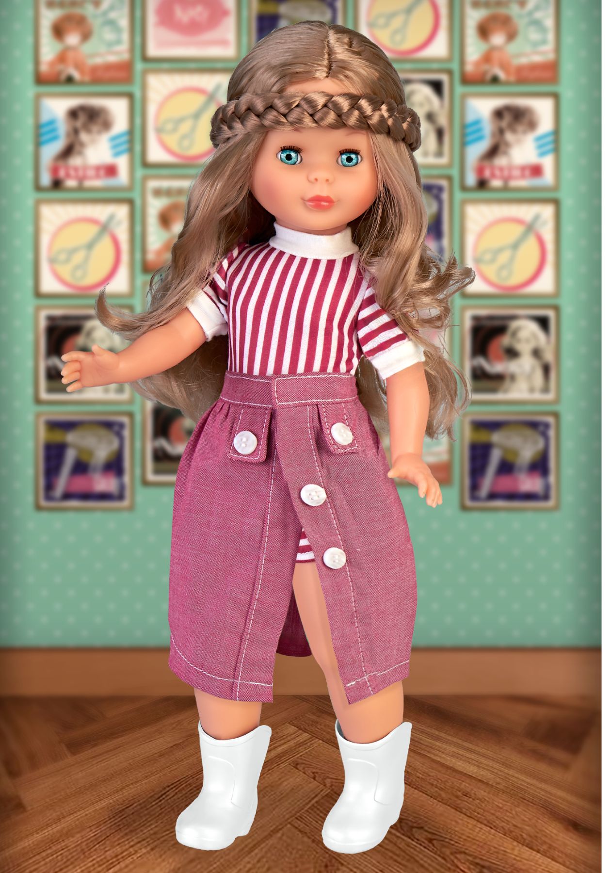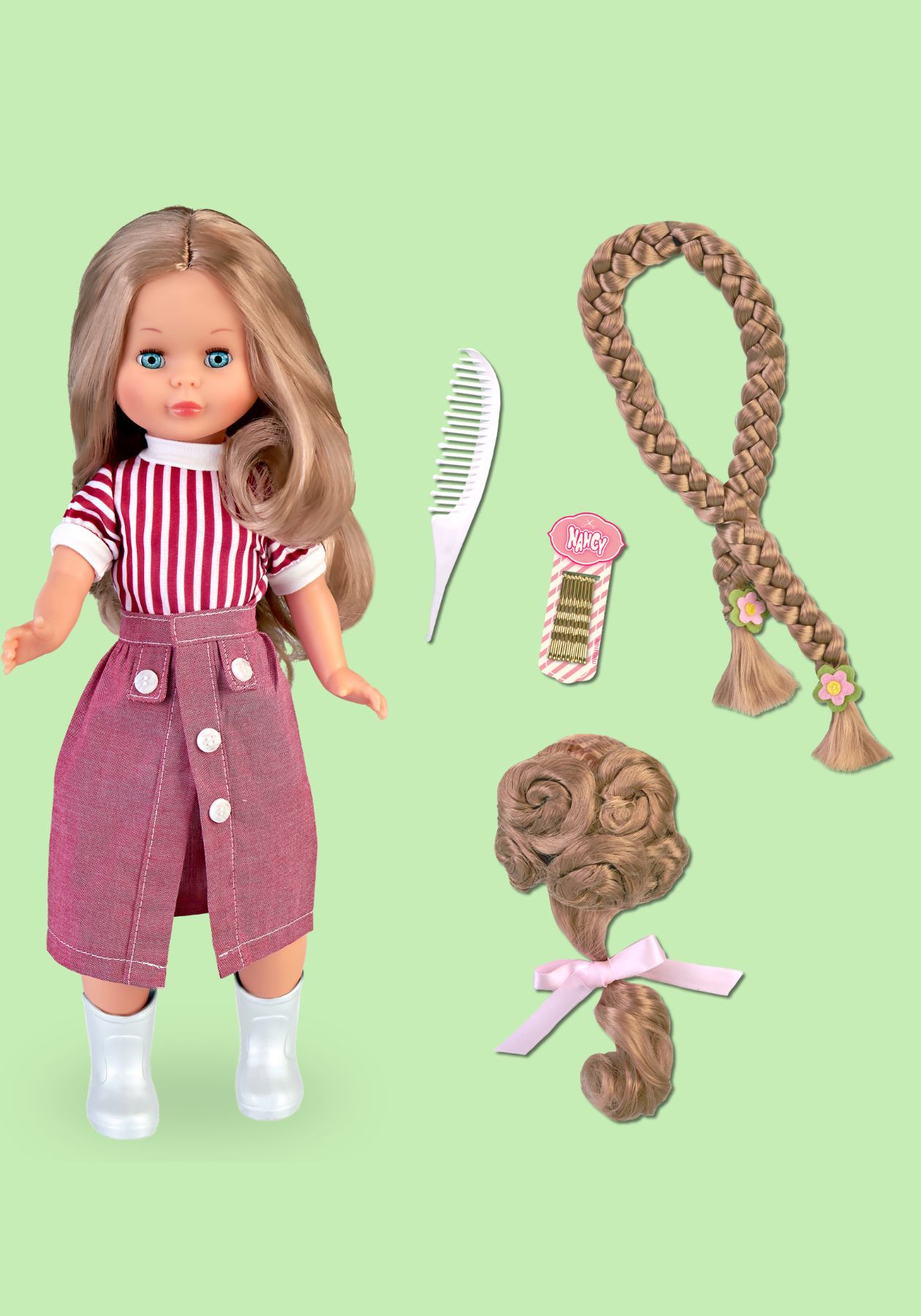 Nancy Colección Trousseau Peinados es una reedición del modelo original de 1973. Nancy luce una melena rubia, larga y ondulada, perfecta para experimentar con diferentes peinados y estilos. Para ello, se incluyen dos postizos de pelo: una elegante trenza y un sofisticado moño. Además, viene con un peine y varias horquillas para crear los peinados más impecables. Nancy viste un conjunto veraniego compuesto por un mono corto a rayas blancas y rojas que combina con una falda midi granate adornada con botones. Para completar su look y añadirle un toque sofisticado, Nancy lleva unas botas de caña media blancas. Cuenta con certificado de autenticidad y de número de serie.