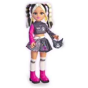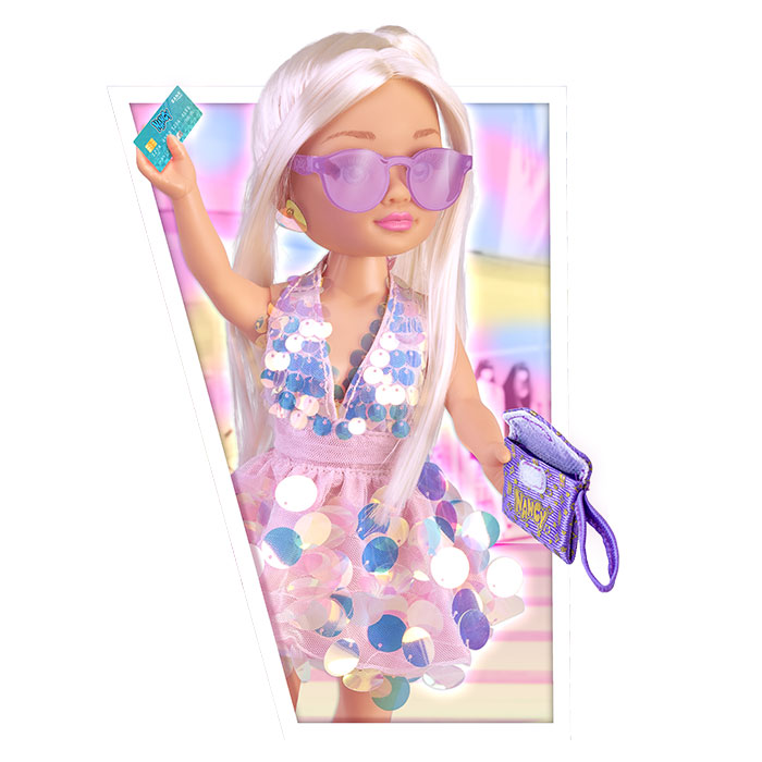 Nancy articulada vestida em um estilo girly: vestido curto de lantejoulas em tons de rosa; e carro com rodas que giram de verdade.